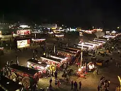 A showman's road locomotive or showman's engine is a steam-powered road-going 'locomotive' designed to provide power and transport for a travelling funfair or circus. Similar to other road-going traction engines, showman's engines were normally distinguished by the addition of a full-length canopy, a dynamo mounted in front of the chimney, and brightly coloured paintwork with ornate decorations. The dynamo was used to generate electricity to illuminate and power various fairground rides. Although originally the ride's motion was powered by an internal steam engine, some later rides were driven direct from the showman's engine via a belt drive.