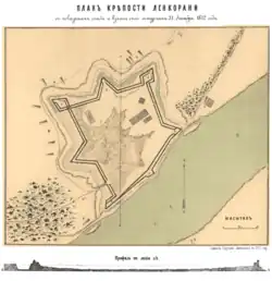 The siege of Lankaran (Persian: محاصره لنکران; Russian: Штурм Ленкорани) took place from 7 January to 13 January 1813 during the Russo-Iranian War of 1804–1813. Lankaran, a city in the Talish region, was previously held by Mir-Mostafa Khan of the Talysh Khanate, a subject of Iran. However, due to his defiance, he was ousted from the city by Iranian forces in August 1812. Now directly held by the Iranians, the city was soon besieged by the Russian commander Pyotr Kotlyarevsky, who had recently defeated the Iranian crown-prince Abbas Mirza at the battle of Aslanduz.