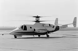 The first S-69 built (73-21941) first flew on July 26, 1973.[2] However, it was badly damaged in a low-speed crash on August 24, 1973 due to unexpected rotor forces and insufficient control systems.[3] The airframe was then converted into a wind tunnel testbed, which was tested in the NASA Ames Research Center 40x80 feet full-scale wind tunnel in 1979.[4] A second airframe was completed (73-21942) which first flew on July 21, 1975. After initial testing as a pure helicopter, two auxiliary turbojets were added in March 1977. As a helicopter, the XH-59A demonstrated a maximum level speed of 156 knots (289 km/h; 180 mph), but with the auxiliary turbojets, it demonstrated a maximum level speed of 238 knots (441 km/h; 274 mph) and eventually a speed of 263 knots (487 km/h; 303 mph) in a shallow dive. At 180 knots (333 km/h; 207 mph) level flight, it could enter a 1.4 g bank turn with the rotor in autorotation, increasing rotor rpm.[5] Airframe stress prevented rotor speed reduction and thus full flight envelope expansion.[5] The XH-59A had high levels of vibration and fuel consumption.[6][3]