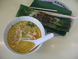 Three noodle dishes stand out in Singapore cuisine. "Hokkien prawn mee" comprises fried egg noodles and rice noodles with prawns, sliced pork, fishcake and squid. It is stir-fried with a broth usually made from prawns. "Nyonya laksa" is composed of rice noodles served in a coconut prawn broth. "Char kway teow" is stir-fried rice noodles with prawns, Chinese sausage, bean sprout, lard and cockles.
