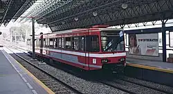 The first 16 TLG-88 (Tren Ligero de Guadalajara, 1988) cars were built by Concarril in Ciudad Sahagún,[6] using propulsion equipment from Melmex (Mitsubishi Electric of Mexico).[18] Another 32 TEG-90 (Tren Eléctrico de Guadalajara, 1990) cars were ordered in 1992 and were manufactured by Bombardier-Concarril SA, a subsidiary of Bombardier Transportation, which had acquired Concarril that year; the TEG-90 cars were built in the same factory as the earlier batch of TLG-88 cars.[6] The first car was delivered in November 1993.[6] The TEG-90 are cosmetically similar to the TLG-88 but use propulsion equipment from Siemens. Both the TLG-88 and TEG-90 are derived from the Stadtbahnwagen B design.[13]