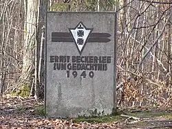 The ski jumping hill in Dolina Radości, located in Oliwa, was the first such hill to be built in Gdańsk, then known as the Free City of Danzig. It was completed in 1932 and had a construction point of 35 metres (115 ft).[1] In 1940, Ernst Becker-Lee, a German ski jumper, died on the hill. A small memorial was erected near his place of death.[2] Regular competitions were held into the mid-1950s, with the hill's record being set by a jumper from Zakopane who had the surname Kołtuń, at 39 metres (128 ft).[1]
