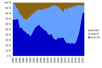 A solar cell, also known as a photovoltaic cell (PV cell), is an electronic device that converts the energy of light directly into electricity by means of the photovoltaic effect.[1] It is a type of photoelectric cell, a device whose electrical characteristics (such as current, voltage, or resistance) vary when it is exposed to light. Individual solar cell devices are often the electrical building blocks of photovoltaic modules, known colloquially as "solar panels". Almost all commercial PV cells consist of crystalline silicon, with a market share of 95%. Cadmium telluride thin-film solar cells account for the remainder.[2] The common single-junction silicon solar cell can produce a maximum open-circuit voltage of approximately 0.5 to 0.6 volts.[3]