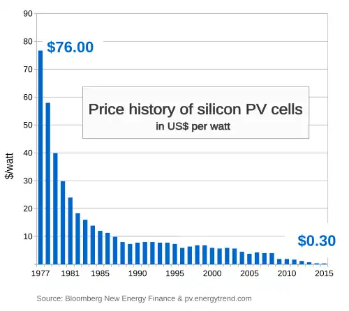 Price per watt history for conventional (c-Si) solar cells since 1977
