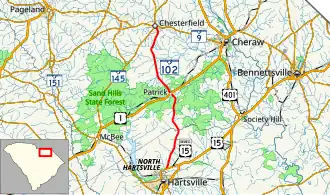 SC 102 begins at an intersection with U.S. Route 15 Business (US 15 Bus.; North 5th Street) in North Hartsville, within Darlington County, where the roadway continues as Patrick Highway. It travels to the north-northeast and leaves the city limits of the city. It travels through rural areas of the county. Then, it crosses over Cedar Creek, where it enters Chesterfield County. SC 102 curves to the north-northwest for a short while before traveling in a fairly northerly direction. Just before entering Patrick, the highway goes through Sand Hills State Forest. In town is an intersection with US 1 (Main Street). It winds its way through rural areas of the county until it meets its northern terminus, an intersection with SC 9 (East Boulevard) in Chesterfield, where the roadway continues as South Craig Street.[3]