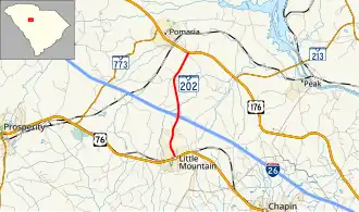 South Carolina Highway 202 (SC 202) is a 4.520-mile-long (7.274 km) state highway in the U.S. state of South Carolina. The highway connects Little Mountain and the Pomaria area. Though signed as an east-west highway, it runs in a south-to-north fashion.