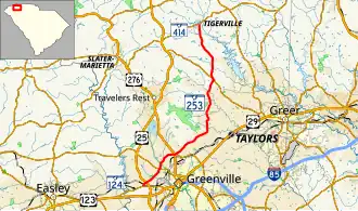 South Carolina Highway 253 (SC 253) is a 19.656-mile (31.633 km) primary state highway in the U.S. state of South Carolina. It runs in Greenville and is the gateway to Paris Mountain State Park and runs from Parker to Tigerville.