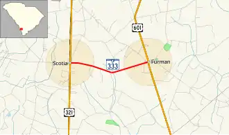 South Carolina Highway 333 (SC 333) is a 3.340-mile (5.375 km) primary state highway in the U.S. state of South Carolina. It serves as a connector highway between the towns of Scotia and Furman.