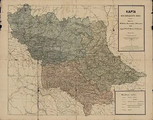 Southwestern Krai (Russian: Юго-западный край, romanizedYugo-zapadny kray), also known as Kiev General Governorate or Kiev, Podolia, and Volhynia General Governorate (Russian: Киевское, Подольское и Волынское генерал-губернаторство, romanizedKievskoye, Podol'skoye i Volynskoye general-gubernatorstvo) was an administrative-territorial and political subdivision (a krai) of the Russian Empire in 1832–1914.[1] It has a special status established for the gradual political and economical integration and assimilation of the non-Russian (Ukrainian, Jewish, Polish, Tatar) population of right-bank Ukraine within the Russian Empire.[1]