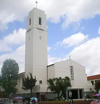 Construction of the new church began in early 1949. The building was constructed with reinforced concrete, structural steel roof framing, and a tile roof. The design was described as "a restrained modern style."[13][14] The church was designed by architect George J. Adams with assistance from Armet and Davis.[13]
