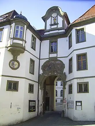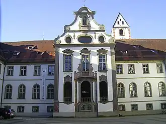 The north wing was used as the town hall. In the south wing the Füssen Town Museum is now located, with displays on the history of the abbey and of the town, particularly of the traditional manufacture of lutes and violins in Füssen.[3] It is also possible to view the Baroque reception rooms of the abbey in the museum.