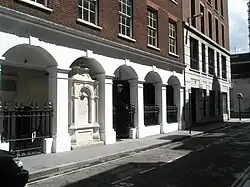 Along with the majority of 97 parish churches in the City of London, St John the Baptist upon Walbrook was destroyed by the Great Fire in September 1666.[4] In 1670 a Rebuilding Act was passed and a committee set up under Sir Christopher Wren to decide which would be rebuilt.[5] St John the Baptist was not one of the 51 chosen;[6] instead the parish was united to that of St Antholin, Budge Row,[7] and the site retained as a graveyard.[2]