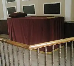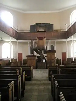 Inside, the most prominent features are these galleries, which form a rectangle and are held up on Egyptian-style iron columns,[3] and the large pulpit, which "towers over everything".[10][14] The layout and these fittings "represent a unique survival"[9] and a "superb example"[15] of a late Georgian style which was quite common in the early 19th century, particularly in Nonconformist chapels but also in Anglican churches with a Low church character.[9] The galleries are of American birch and are reached by staircases which have separate entrances in the single-storey wings to the side of the main entrance. Separate entrances were characteristic of churches of this era, which often required the sexes to sit apart; also, at St John the Evangelist's Church, the free pews (on the ground floor) were kept separate from those owned by the proprietors (in the galleries).[9][16] The pulpit stands centrally in the nave, hiding the small chancel and sanctuary.[15] It has been called the best surviving three-decker pulpit in Sussex.[17] An unusual refinement of the more common two-decker structure, a three-decker allowed different parts of the service to be read from different levels according to their importance. Responses to prayers were read from the lowest deck, usually by the church clerk. The main part of the service, including prayers, came from the middle deck; and the sermon—the most important part of a Low church service—took place in the circular upper deck.[17] The pulpit is free-standing on a fluted stem with a spiral motif.[10] Like the rest of the internal fittings, it is of American birch.[5][17] The three sections are now side by side, but originally they were aligned one in front of the other in a tiered formation.[17]