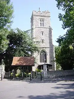 The tower is Perpendicular (late medieval) and was described by Nikolaus Pevsner as 'one of the best of the Middlesex type'. It is similar to the tower of All Saints, Isleworth. It has a south-east turret, diagonal buttresses, a three-light west window and tall, two-light, transomed windows with square heads to the belfry stage. There are embattled parapets and carved gargoyles. The west porch has a four-centred outer arch and foliated spandrels. The body of the church, rebuilt in the 19th century, is in the style of c.1300.[7] The church is a Grade II* listed building.[7]