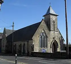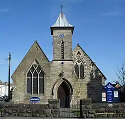 Henry Carpenter's chapel has been added to several times since its construction in 1857, but still retains its Early English Gothic appearance.[35] It is built entirely of stone, and has a tower at the west end (now with a low pyramid-shaped spire), an aisled nave, chancel, partly glazed wooden porch, vestry, kitchen and a large attached hall.[35][38] The windows are mostly lancets; some have stained glass.[25]