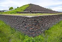 There are earthwork step pyramids in Japan. Those are Buddhist relics built as pagodas during the Nara period. One of them Dotō are located at the ruins of Onodera Temple in Sakai, Osaka. The earthen pagoda, about 53 meters on each side and about 9 meters height, consists of 13 layers of clay blocks stacked side by side in a stepped pyramid with earth in between.[18] The exposed portion each layer was covered with clay roof tiles, totaling about 60,000 in all. A structure similar to the Dotō is the Zutō in the Takabatake neighborhood of Nara city.