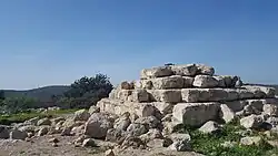 A rare example of a stepped pyramid in Israel can be found at Horvat Midras, an archaeological site that was a Jewish settlement during the Roman era. Situated atop a hill in the Judaean Lowlands in central Israel, the pyramid originally crowned a monumental funerary structure (nefesh).[17] This structure is considered one of the few rural "display tombs" in Second Temple-era Judea, a burial monument designed not only for commemoration but also for visibility and public recognition—characteristics typically associated with urban burial sites, such as those in Jerusalem.[17] The pyramid's position, visible from all directions including up to 6.25 km away and from the nearby road, and its imposing design, suggest it was a prominent status symbol for the wealthy family buried there. This family may have had connections to the Herodian dynasty, which ruled Judaea as a client kingdom under Rome during the first century BCE and CE.[17]