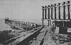 A wooden jetty was constructed around 1880 at Bass Point—an area also known in those times as 'Long Point'—to load crushed stone from an adjacent quarry.[10][22] The jetty was 500 feet long. In 1904, Dunmore was berthing here four times a week, and each time would load 300 tons, in under two hours.[21] The jetty was damaged by storms in 1922 and repaired.[23] The jetty closed during the Second World War and did not resume operation after the war. It survived until 1957, when it was damaged in bad weather;[10] its remains were demolished in 1958.[24]