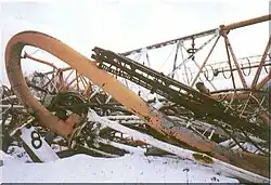 On 8 August 1991 at 16:00 UTC the Warsaw radio mast near Gąbin, Poland, the tallest man-made object ever built before the erection of Burj Khalifa, collapsed as a consequence of an error in exchanging the guy-wires on the highest stock. The mast first bent and then snapped at roughly half its height. It destroyed at its collapse a small mobile crane of Mostostal Zabrze. As all workers had left the mast before the exchange procedures, there were no fatalities, in contrast to the similar collapse of the WLBT Tower in 1997.