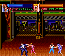 Super Double Dragon is one of the few games in the series where the protagonists of Billy and Jimmy Lee were differentiated, not just in their in-game character designs (where the brothers were given different hair styles), but also in their fighting abilities. Particularly, the two characters have different basic punches (in Return of Double Dragon, Jimmy's roundhouse kick is also different).