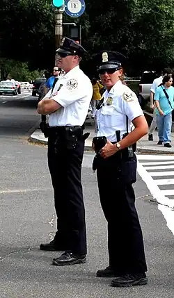 The Supreme Court of the United States Police Department (SCUSPD),[1] commonly referred to as the Supreme Court Police, is a United States federal security police agency responsible for security and law enforcement services concerning the properties, personnel, and visitors of the Supreme Court of the United States. The SCUSPD enforces federal and District of Columbia laws and regulations, as well as enforces regulations governing the Supreme Court Building and grounds as prescribed by the head of the SCUSPD (the Marshal of the United States Supreme Court) and as approved by the Chief Justice of the United States. In addition to more common law enforcement tasks, SCUSPD personnel, in conjunction with United States Marshals Service personnel, are responsible for providing personal protection details to Supreme Court justices (and the chief justice) both domestically and internationally, as well as the justices' homes. Sworn SCUSPD personnel may exercise law enforcement powers and carry firearms throughout the District of Columbia, and nationally when protecting SCOTUS justices or property; such authority is derived from 40 U.S.C. § 6121.