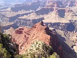 The Alligator (Grand Canyon), is a 5,774-foot (1,760 m)-elevation summit, a large ridgeline butte, connected to, and below Mohave Point (South Rim), approximately 1.5 miles (2.4 km) northwest of Grand Canyon Village, Grand Canyon. The ridgeline trends north, and the lower elevation cliff, the tail of the alligator, turns northwest. The Alligator landform is about 1.0 mile (1.6 km) from the west-flowing Colorado River, and Granite Gorge. The Alligator lies between the Monument Creek (Grand Canyon) drainage, west, and the Salt Creek (Grand Canyon) drainage, east, both short, south tributaries to the Colorado.