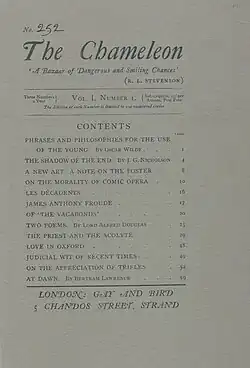 The Chameleon was conceived by John Bloxam, an undergraduate at Oxford University. It was originally to be titled The Parrot Tulip, but the name The Chameleon was chosen by George Ives in a meeting between Ives, Bloxam, and Oscar Wilde in London.[2] Bloxam showed his story "The Priest and the Acolyte" to Wilde and Ives. Wilde encouraged him to publish it, while Ives urged caution.[3] Bloxam published no further writing after The Chameleon, and would go on to be ordained as a priest in 1897, spending the remainder of his life in the clergy.[4]