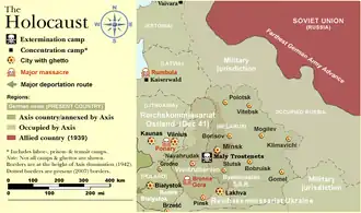 The Holocaust saw the systematic extermination of Jews living in Byelorussia during its occupation by Nazi Germany in World War II. Before the construction of the Extermination Camps in Poland, the Holocaust was to be carried out in Belarus and the Baltic states using large gassing installations and transport by boats on the waterways rather than by trains. Although the Extermination Camps were eventually established in occupied Poland, roughly 800,000 Belarusian Jews (or about 90% of the Jewish population of Belarus) were murdered according to one estimate.[1] Other estimates place the number of Jews killed between 500,000 and 550,000 (about 80% of the Belarusian Jewish population).[2]