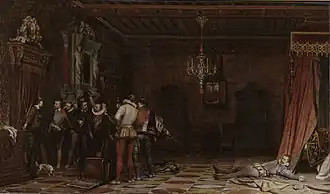 Another source may have been music and opera, since a lyre is shown in the foreground. The Orchestre du Capitole de Toulouse produced Étienne-Nicolas Méhul's opera Stratonice several times whilst Ingres was a violinist with them. The painting shows the moment of the heroine's solo from Méhul's opera. The Assassination of the Duke of Guise was also based on an opera, Giacomo Meyerbeer's Les Huguenots.[6]