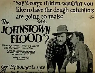 The Johnstown Flood is a 1926 American silent epic film directed by Irving Cummings, that addresses the Great Flood of 1889 in Johnstown, Pennsylvania. The film stars George O'Brien, Florence Gilbert, and Janet Gaynor.[1]