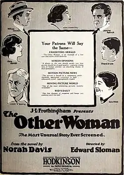 The Other Woman is a 1921 American silent drama film directed by Edward Sloman and starring Jerome Patrick, Jane Novak and Helen Jerome Eddy.[1] According to The Encyclopedia of Martial Arts Films, this is the first Western film to depict a martial arts fight, in this case using jujutsu.[2]