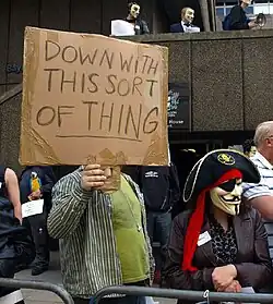 During a number of high-profile UK protests, including throughout the Pope's state visit in September 2010 and student protests against tuition fee rises in November 2010, as well as protests against the Irish EU bailout and austerity measures in November 2010, several protesters displayed banners saying, "Down with this sort of thing" and "Careful now".