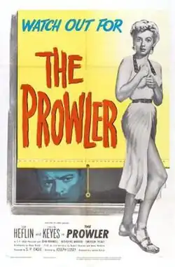 The Prowler is a 1951 American film noir thriller film directed by Joseph Losey that stars Van Heflin and Evelyn Keyes.[1][2][3] The film was produced by Sam Spiegel (as S.P. Eagle) and written by Dalton Trumbo.[4] Because Trumbo was blacklisted at the time, the screenplay was credited to his friend, screenwriter Hugo Butler, as a front.[5]