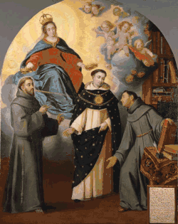 It shows the eponymous Franciscan friar to the right unable to understand a passage in Thomas Aquinas's Summa Theologica and praying to Francis of Assisi, shown on the left granting his prayer and pointing to Thomas himself in the centre.[2]