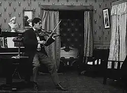 The Voice of the Violin is a 1909 short drama film directed by D. W. Griffith. It is preserved from a paper print at the Library of Congress and a 35 mm print at the George Eastman Museum.[1] Arthur V. Johnson is a musician, who makes a living with classes of violin. He and his student Marion Leonard like each other a lot, but she rejects him for being too poor for her. He then decides to join a communist group and fight for equality of all. Right away, he draws a lot to plant the next bomb in a rich man's house. With the plot under way, he realizes that this is the home of his love interest, and he desperately tries to prevent the bomb from exploding.