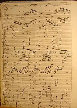 The libretto was written by Louise Otto-Peters, who had already shown ardent interest in patriotic subjects as a youth.[1] It depicts the last episode of Theodor Körner's life from the beginning of his military engagement until his death. Körner, a famous German poet during the Wars of Liberation against Napoleonic hegemony, was free of personal worries due to his professional success culminating in the appointment as k. k. Hoftheaterdichter,[2] a playwright of the imperial court at the Burgtheater in Vienna. He nonetheless voluntarily joined the famous Lützow Free Corps as he wanted to deliver Germany from French dominance, writing to his father: "Yes, my dearest father, I want to become a soldier. I want to give up the newly acquired happy and carefree live joyously in order to fight for my fatherland, even if I have to spill my blood. […] No one is too valuable for the death for the liberty and the honour of his nation, but many are not valuable enough."[3][4] In 19th-century Germany, Körner hence became a national hero.[5]
