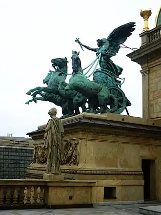 There are two triga sculptures installed on the roof corners of the National Theatre in Prague, Czech Republic. The horses are controlled by the winged goddess Victoria. The sculptures were proposed and modeled by Czech sculptor Bohuslav Schnirch (1845–1901) and created by Ladislav Šaloun (1870–1946). The works were installed in 1911. Šaloun's wife, Julia, served as the model for Victoria. The statues were renovated several times, most recently in 2008.[1]