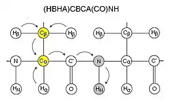 CBCA(CO)NH, or alternatively HN(CO)CACB, correlates the resonances of the amide of a residue with the Cα and Cβ of the preceding residue.[11] Two peaks corresponding to the Cα and Cβ are therefore visible for each residue. This experiment is normally used together with HNCACB. The sidechain carboxamide of glutamines and asparagines also appear in this spectra in this experiment. CBCA(CO)NH is sometimes more precisely called (HBHA)CBCA(CO)NH as it starts with aliphatic protons and ends on an amide proton, and is therefore not an out-and-back experiment like HN(CO)CACB.