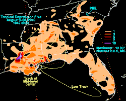 The remnants of Tropical Depression Five moved ashore on Louisiana on August 12, by which time the circulation had become better defined.[11] A small circular area of convection was observed on radar approaching New Orleans, supported by diffluence from an anticyclone over Georgia.[12] The system moved slowly, turning northeastward and tracking inland along southern Mississippi on August 13.[13] By late on August 14, the remnants reached central Alabama and began to move southward due to a ridge to its north.[14] The next day it reached the Florida Panhandle, and before the low reached open waters, the NHC assessed a 50% chance for redevelopment due to favorable conditions.[15] Early on August 16, the low reached the Gulf of Mexico,[16] and a hurricane hunters flight reported a weak circulation and convection that was disorganized and disassociated. Upper-level conditions remained only marginally favorable, although the NHC noted that "only a small increase in organization would result in the formation of a tropical depression."[17] Early on August 18, the remnants of the system dissipated over Southwestern Mississippi.[18]