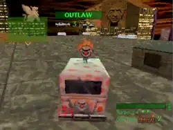 Twisted Metal is a vehicular combat game in which the player takes control of one of twelve unique vehicles. While in control of a vehicle, the player can accelerate, steer, brake, reverse, activate the turbo, turn tightly, toggle between and activate weapons using the game controller's d-pad and buttons.[4] The game can be played in either the one-player mode (in which the game's story takes place) or the Duel Mode (in which two human players can select a battleground on which to compete in). In the one-player mode, the player must progress through six combat arenas of progressively increasing size and featuring progressively more opponents. To clear a level, the player must destroy all of the enemy vehicles in that level. The game lasts until all of the player's lives have expired or until all six levels have been cleared.[5]