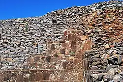 At the front of the platform, facing out towards Lake Pátzcuaro, are five yácata pyramids in a row roughly from north to south. Unlike Aztec or Mayan pyramids, these structures are rounded, not square. The five structures are roughly keyhole shaped, linked together at the back by stepped pyramidal platforms. The core of each of these structures is piled-up rubble which was then faced with stone slabs decorated with spirals, circles and other geometric designs and petroglyphs.[2] These fitted stone slabs are similar to the masonry used by the Incas in South America. Another distinction of this and other Purépecha architecture is that no indication of stucco has ever been found.[1][4]
