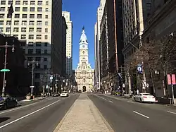 The route then transitions to a six-lane divided highway and runs past commercial development and high-rise buildings, including several theaters. The road passes to the east of the former University of the Arts and the Kimmel Center for the Performing Arts between the Pine Street and Spruce Street intersections and heads east of the Academy of Music at the Locust Street intersection. The route crosses Walnut Street and Chestnut Street before it comes to Penn Square, a square-shaped traffic circle that runs around Philadelphia City Hall which is formed by South Penn Square to the south, Juniper Street to the east, John F. Kennedy Boulevard to the north, and 15th Street to the west.