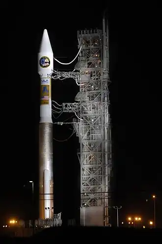 USA-200 was launched by an Atlas V launch vehicle, flying in the 411 configuration, operated by United Launch Alliance. The launch vehicle was the first Atlas V to launch from Vandenberg Air Force Base, flying from Space Launch Complex 3E.[3] Liftoff occurred at 10:02 UTC on 13 March 2008.[4][5] It was identified as NRO Launch 28,[6] and was the thirteenth flight of an Atlas V. The launch vehicle had the tail number AV-006.[4]
