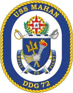 USS Mahan (DDG-72) is an Arleigh Burke-class (Flight II) Aegis guided missile destroyer currently in service with the United States Navy and is the first of the Flight II variant. This ship is the 22nd destroyer of her class. USS Mahan was the 12th ship of this class to be built at Bath Iron Works in Bath, Maine, and construction began on 17 August 1995. She was launched and christened on 29 June 1996. On 14 February 1998 she was commissioned in Tampa, Florida. Mahan is homeported in Norfolk, Virginia, and as of 2012 was attached to Destroyer Squadron 2. By 2016, the ship was part of Destroyer Squadron 22.[4]