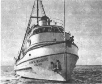 An 86-foot-6-inch (26.37 m) long motor vessel,[2] John R. Manning had a wooden hull,[4] a 320-horsepower (240 kW) Washington Iron Works diesel engine,[4] and two diesel generators for auxiliary power.[2][4] She had a cruising speed of 7.75 knots (14.4 km/h; 8.9 mph)[3] or 9 knots (17 km/h; 10 mph)[4] (sources disagree), and her large fuel capacity gave her a cruising range of 8,000 nautical miles (15,000 km), a longer range than commercial fishing boats of her size made necessary by the vast size — 13,000,000 square miles (34,000,000 km2) — of the ocean area in which she was to operate and the limited refueling options in the area.[2][4] She had a brine refrigeration system capable of preserving 30 short tons (27 t) of tuna for later laboratory analysis ashore,[9] and during construction her brine wells were increased to four from the originally planned two.[10] She also was equipped to take surface and subsurface water temperature readings.[1] Her navigational aids were modern by the standards of 1950 and included LORAN, a radio direction finder, a 250-watt radio telephone and radio telegraph transmitter, and an automatic steering pilot.[4]