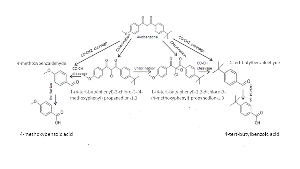 4-tert-Butyl-4’-methoxydibenzoylmethane, known as avobenzone, belongs to dibenzoylmethanes. It is one of the most common UVA (400-320 nm) filters used in sunscreens formulations. It is sold under the trade names Parsol 1789 or Eusolex 9020. Avobenzone exists in two tautomeric forms: enol and keto. In sunscreen formulations, avobenzone exists predominantly in the enol form, which has a maximum absorption at wavelengths ranging from 350 to 365 nm depending on the solvent used. The double bond of the enolic form was shown to be more reactive in conditions of aquatic chlorination than the aromatic ring. In a chlorinated aquatic environment, avobenzone transforms to two corresponding aldehydes and acids, as shown in the figure. Both aldehydes are formed as a result of the CO-CH2 bond. They are less stable in the oxidative conditions and easily transform into the corresponding acids.