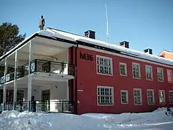 The Swedish Riksdag had in 1929 agreed to the construction of Umedalens hospital, which later came to be Umedalens sjukhus.[3] It was built 1934 according to the blueprint of Carl Westman, who regarded an area near Backen in western Umeå as a suitable place, as the surrounding forests provided a natural barrier against the nearby community. The complex consisted of 22 buildings, which architectural design were inspired by classicism and romantic nationalism, and were marked with the letters M or K, followed by a number. Buildings marked with M denoted those containing males (män, transl. men), while buildings with K housed females (kvinnor, transl. women).[4] Additionally, several culverts were built to connect the buildings, which made it more convenient to transport patients and medicines between them.[5]