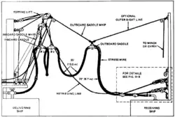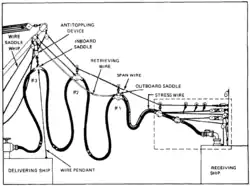 The United States Navy also became interested in the potential of underway replenishment. Lacking a similar collier fleet and network of coaling stations, and embarking on a large naval expansion,[3] the Navy began conducting experiments in 1899 with a system devised by Spencer Miller and the Lidgerwood Manufacturing Company of New York. His device kept a cable suspended between the two ships taut, with a quick-release hook that could travel up and down the line with the use of a winch.[4] The first test of the device involved the collier Marcellus and battleship Massachusetts.[5]