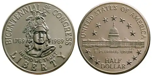 The Bicentennial of the United States Congress Commemorative Coin Act (Pub. L. 100–673) authorized the production of three coins, a clad half dollar, a silver dollar, and a gold half eagle. Congress authorized the coins to commemorate the bicentennial of the United States Congress. The act allowed the coins to be struck in both proof and uncirculated finishes.[1]