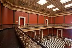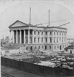 During the war, the building was damaged by shelling. In 1870, construction resumed. The original marble came from Hastings, New York. Because that quarry was abandoned, new marble was obtained from Tuckahoe, New Jersey. Alfred B. Mullett prepared revised drawings.[9] Alterations made at his direction included the loss of the dome, the elimination of the north and south porticoes, and changes to the west entrance.[10] The dome in Ammi B. Young's original design was replaced in 1876[11] with skylights that covered a two-story, square cortile or inside patio.[3] Fluted Corinthian columns surround the iron second floor gallery. The gallery is ornamented with fluted pilasters. The north and south porticoes were probably converted to office space at this stage.[3]